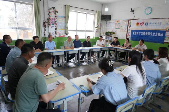 王文昇一行看望慰问了研究生支教团志愿者,实地了解了支教学生的学习、工作、生活情况和科妥小学办学情况,并与当地有关部门负责人、支教团成员进行交流座谈。