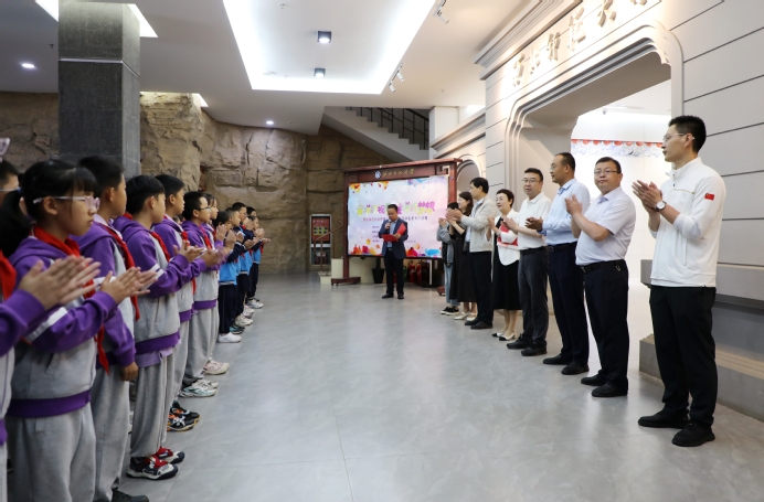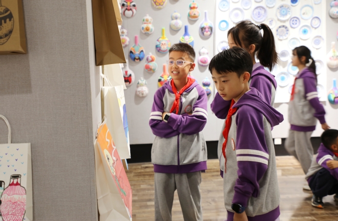 开幕式结束后,与会领导和师生代表共同前往展厅观展,并与AI机器人进行趣味互动。附属小学美术老师和学生讲解员为观展人员进行了详细生动的讲解。